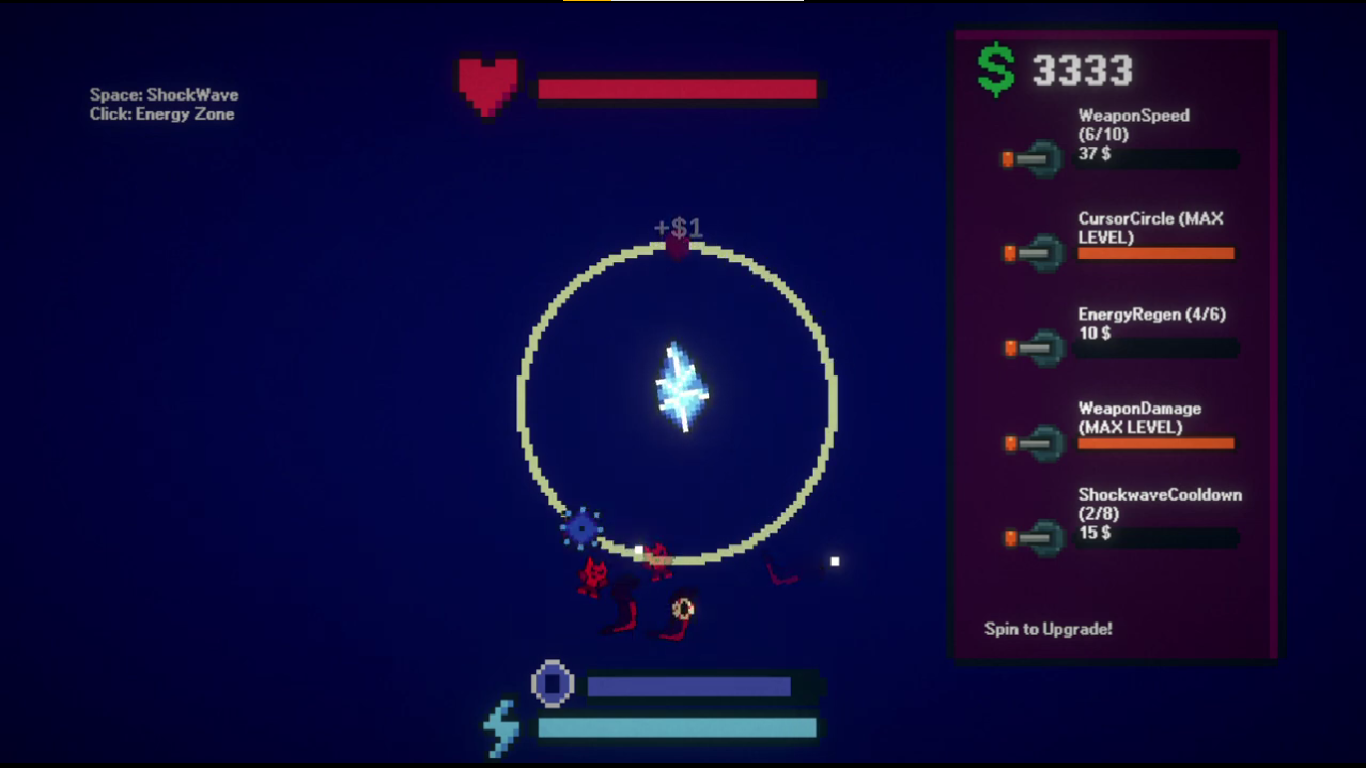 - Right Side Reel: Turn the crank to earn points and buy upgrades.